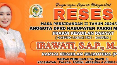 PARIMO, bawainfo.id – Anggota DPRD Parigi Moutong, Irawati, Fraksi PKS (Partai Keadilan Sejahtera) Dapil III Kecamatan Mepanga, Ongka Malino, Tomini, dan Palasa. Menaggapi sejumlah aspirasi masyarakat yang disampaikan dalam pertemuan reses bersama warga di Desa Kotaraya Induk, Kecamatan Mepanga, dan sejumlah Kepala Desa di wilayah tersebut. Jum’at Malam, 26 April 2025.