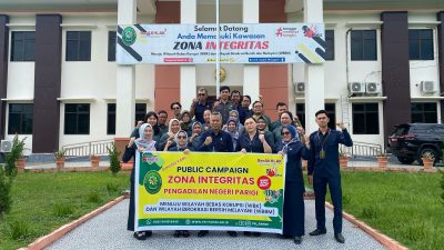 PARIMO, bawainfo.id – Dalam upaya mendukung program Mahkamah Agung Republik Indonesia terkait pembangunan Zona Integritas menuju Wilayah Bebas Korupsi (WBK), Pengadilan Negeri Parigi Kelas II menggelar aksi publik bertajuk “Pengadilan Negeri Parigi Menolak Suap, Pungli dan Gratifikasi. Kegiatan yang berlangsung di Jalan Trans Sulawesi, Kecamatan Parigi, Kabupaten Parigi Moutong ini mendapat sambutan positif dari masyarakat. 29 April 2025.