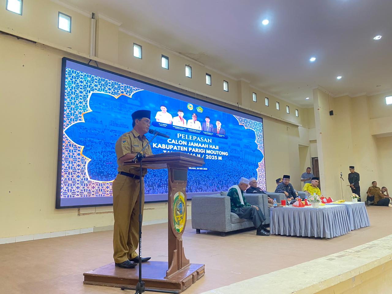 PARIMO, bawainfo.id — Asisten Pemerintahan dan Kesra Abdul Azis Mewakili Pj Bupati Parigi Moutong dalam acara pelepasan Jamaah haji Sebanyak 197 calon jemaah haji, didampingi 1 Tenaga Kesehatan Haji Daerah (TKHD), 1 Tenaga Kesehatan Haji Indonesia (TKHI) dan 1 Pembimbing Ibadah Haji Indonesia (PIHI) yang bertempat di gedung auditorium kantor bupati parigi moutong, Selasa, 20 Mei 2025.
