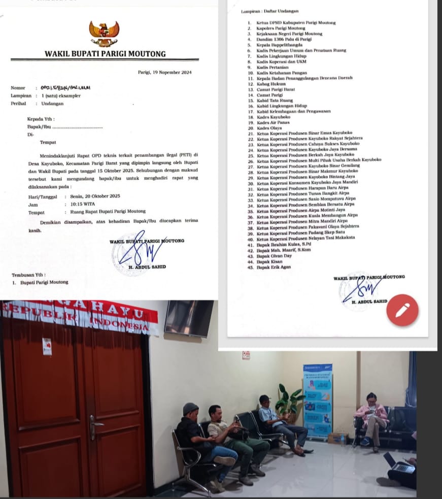 Dalam surat itu tertulis, rapat tersebut merupakan tindak lanjut dari pembahasan sebelumnya terkait aktivitas PETI di Desa Kayu Boko, Kecamatan Parigi Barat, yang dipimpin langsung oleh Bupati dan Wakil Bupati Parimo pada 15 Oktober 2025.