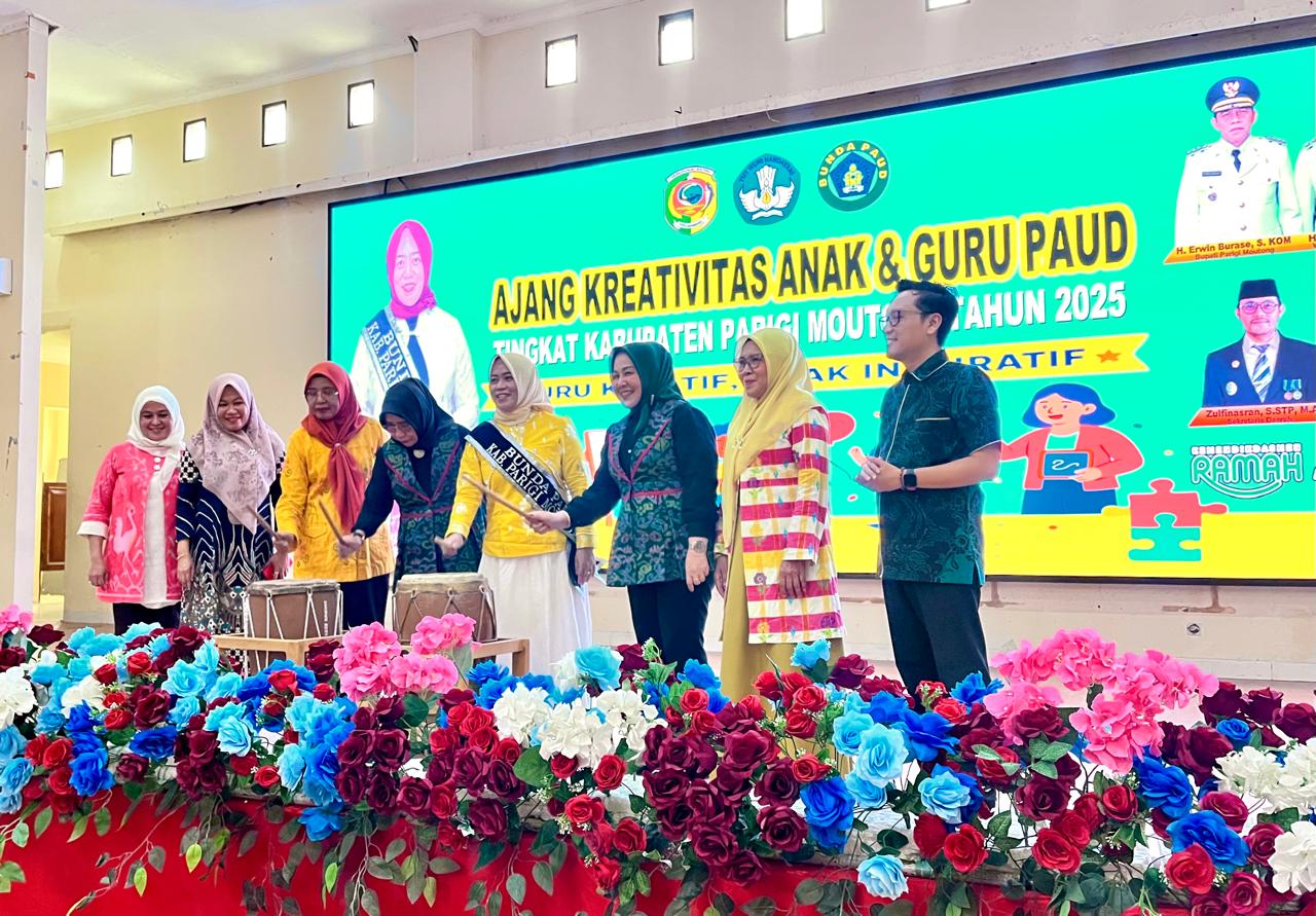 Bunda PAUD Parigi Moutong, Hj. Hestywati Nanga, didampingi para kepala OPD dan pengurus PAUD, memukul gimba sebagai tanda dibukanya Ajang Kreativitas Anak dan Guru PAUD Tingkat Kabupaten Parimo Tahun 2025, di Auditorium Kantor Bupati, Sabtu (29/11/2025).