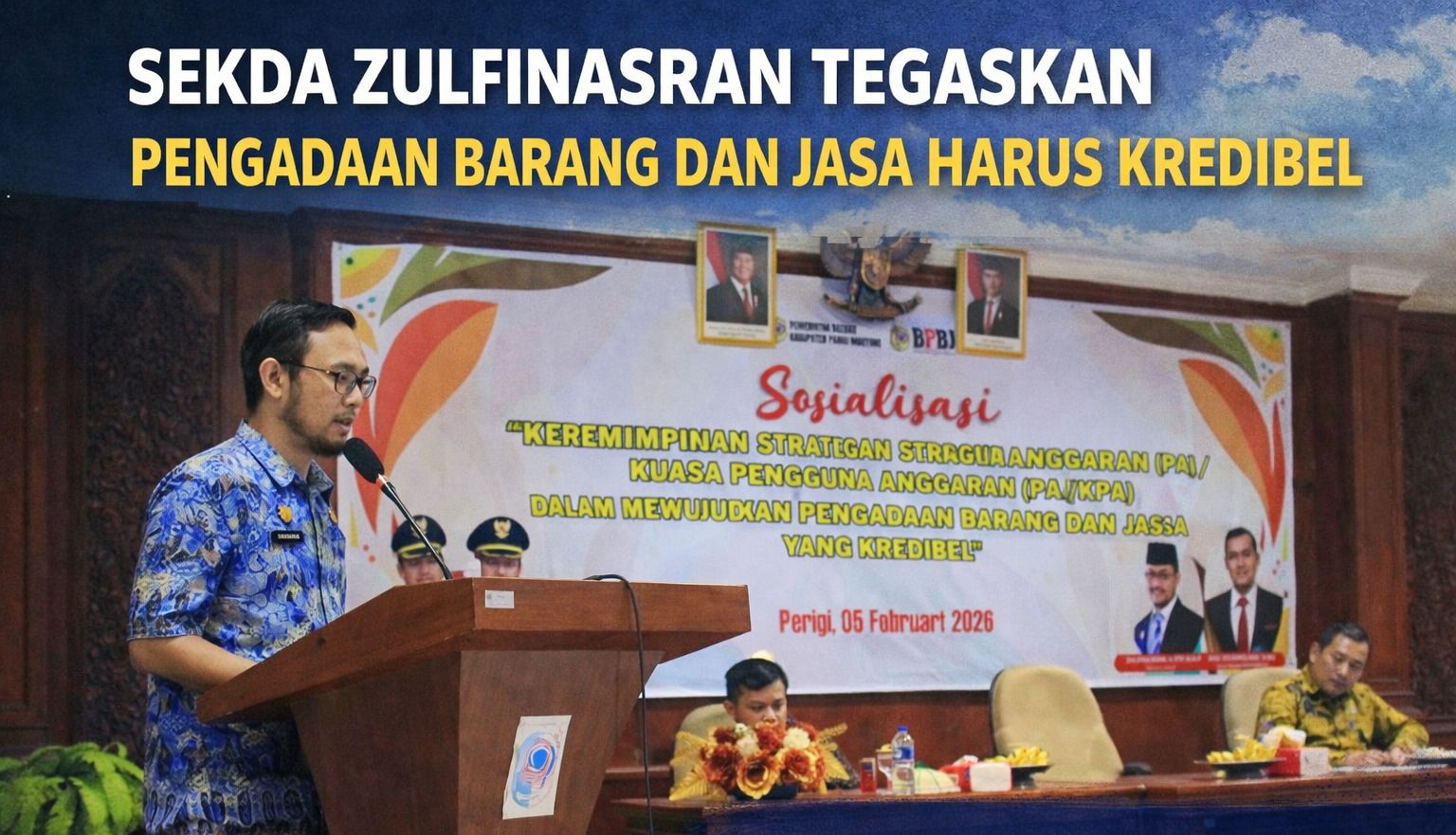 Hal tersebut disampaikan Zulfinasran saat membuka Sosialisasi Kepemimpinan Strategis Pengguna Anggaran dan Kuasa Pengguna Anggaran dalam Mewujudkan Pengadaan Barang/Jasa yang Kredibel Tahun 2026, di Aula Lantai Dua Kantor Bupati, Kamis 05 Februari 2026.