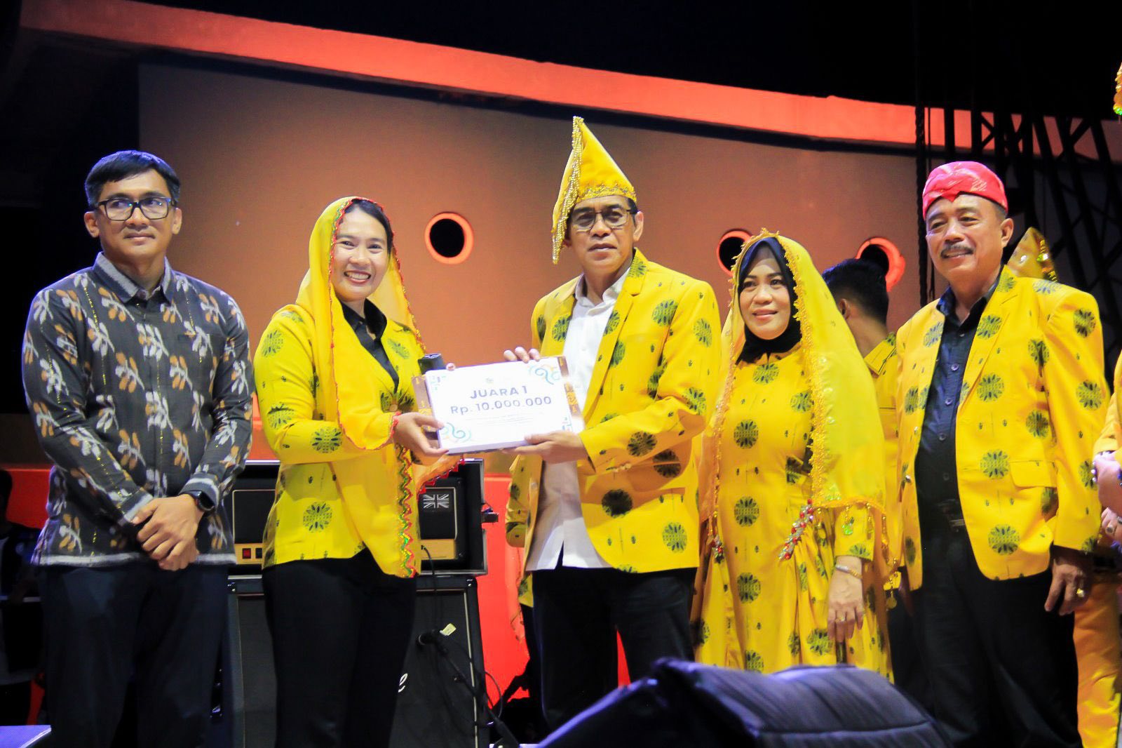 Bupati Parigi Moutong menyerahkan hadiah kepada perwakilan Kecamatan Torue usai meraih Juara I lomba Karnaval Budaya dan Gunungan Buah pada pembukaan Festival Teluk Tomini 2026 di kawasan Sail Tomini, Jumat malam (24/4/2026).
